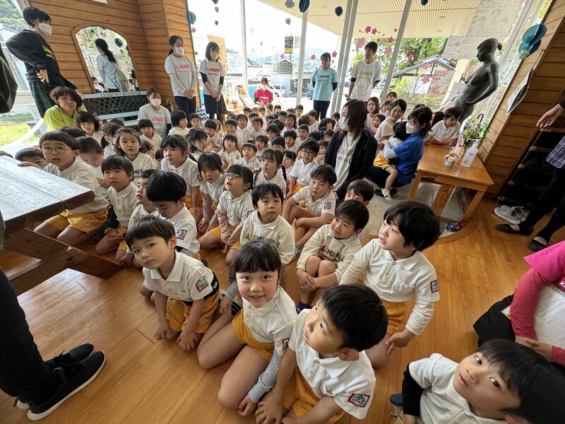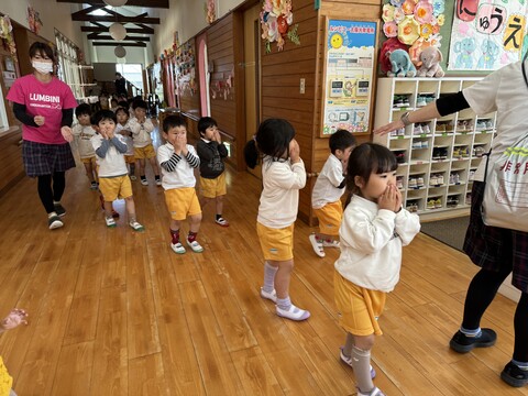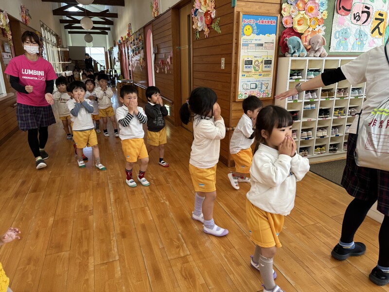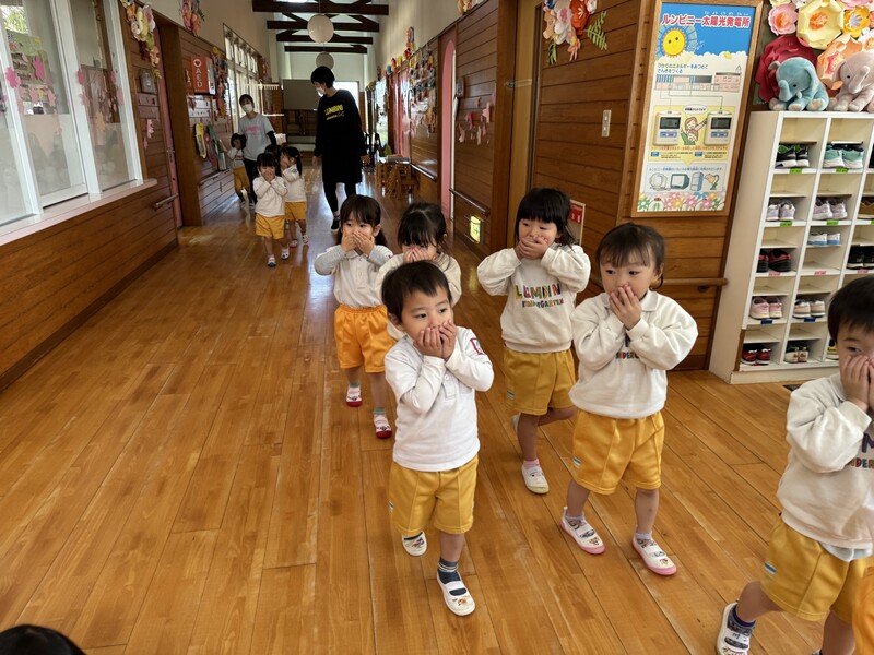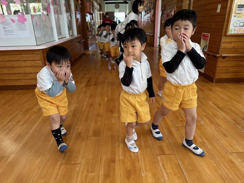 4月25日に避難訓練しました。みんな上手に姿勢を低く、お口に手を押さえてちゃんと避難訓練してましたよ。